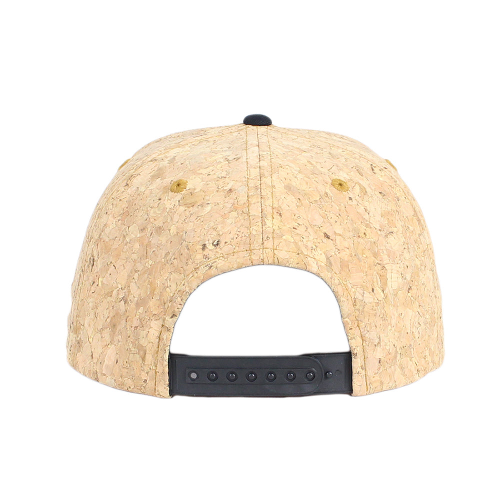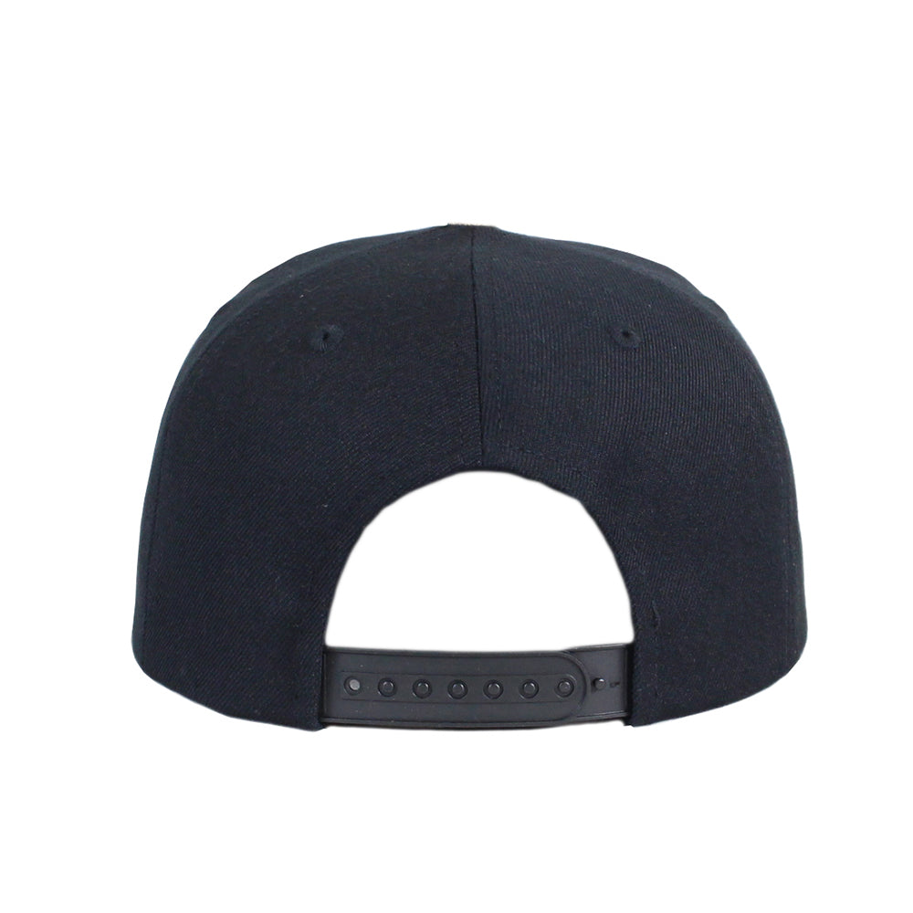 5パネルスナップバックキャップ深さも感じられる昔ながらの王道シェイプ、フロントパネル裏地に固い芯を使用し、後ろ調整部分はパチパチプラスチックストラップ。